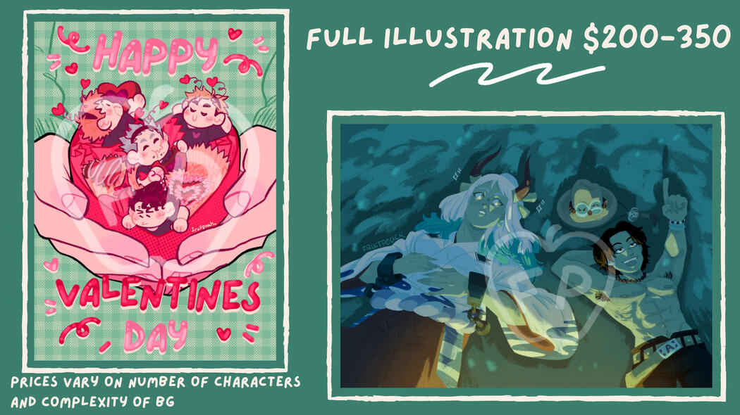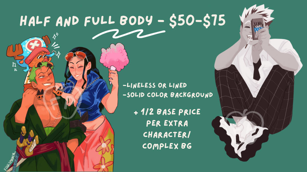 Prices may differ depending on the following: a.) additional characters are included; b) complexity of the piece. These can be discussed when inquiring for a commission piece.